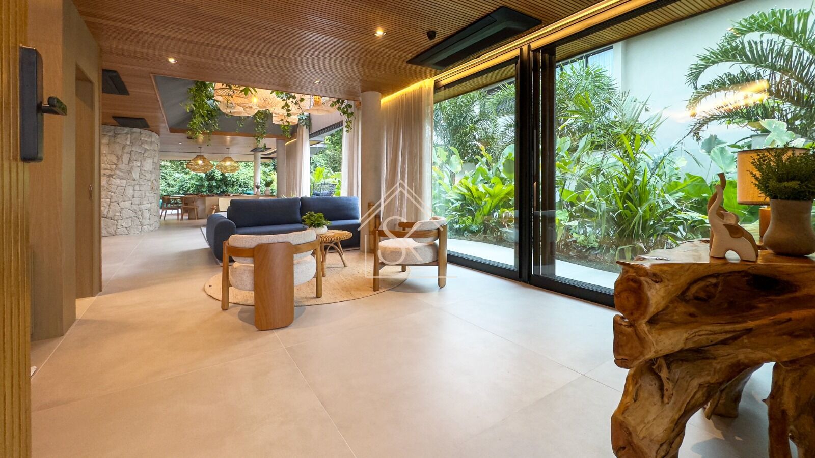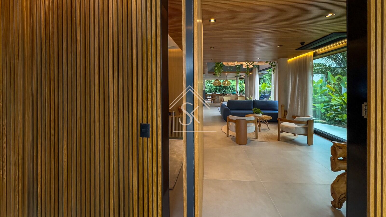 No interior, esse conceito ganhou vida com a assinatura da arquiteta e designer Tehura Pickler, reconhecida por projetos de alto padrão no litoral norte de São Paulo. Sua visão trouxe à Casa Aurora uma leitura sensível: se a Riviera representa o auge da infraestrutura urbanística litorânea, o desafio era resgatar dentro dela a afetividade da casa de praia. Mobiliário artesanal, cestarias, pedras naturais, fibras e cores quentes traduzem esse espírito, em diálogo com a brisa e os aromas da mata.